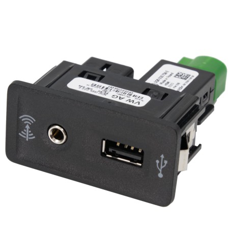 Oryginalna część serwisowa Volkswagena. Port zawierający gniazda USB A oraz AUX In (jack 3,5mm) podłączany w fabryczne miejsce. Przed zakupem sprawdź i porównaj numer części oryginalnej (OE).