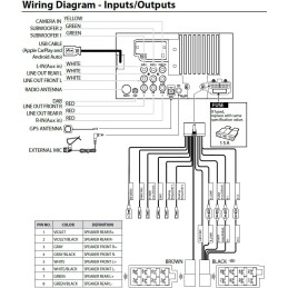 - Złącza w radiu: RCA (SUB1, SUB2, CAM IN, FL/FR, RL/RR, L IN/R IN), MIC, GPS, USB na przewodzie