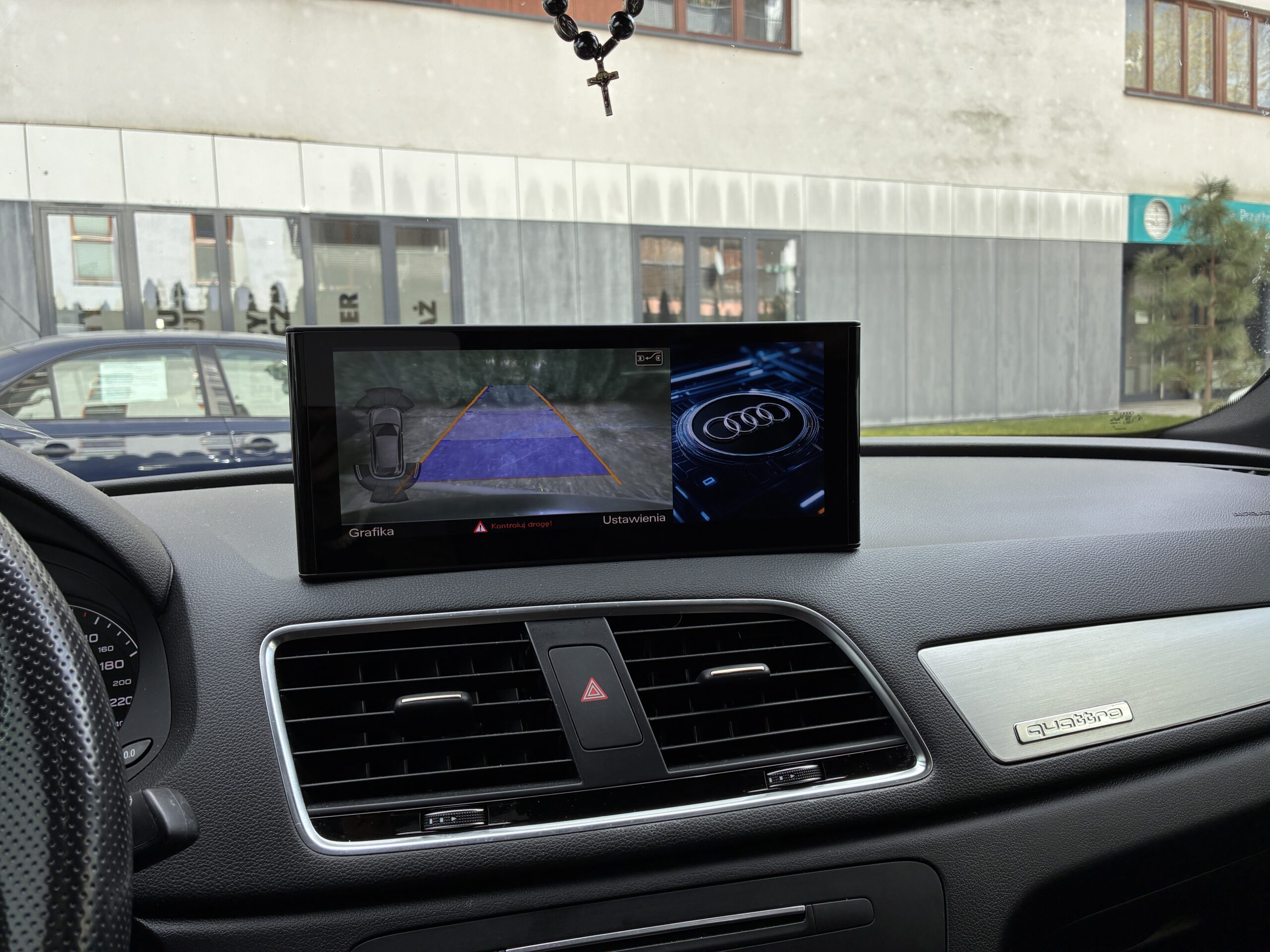 Poniżej wymieniony ekran w Audi Q3 – zachowane opcje fabryczne (fabryczna kamera cofania i czujniki parkowania)