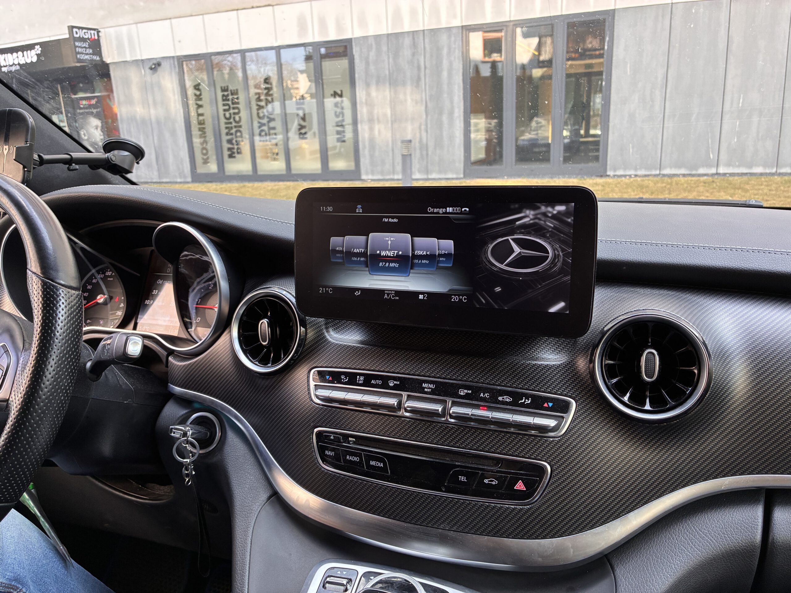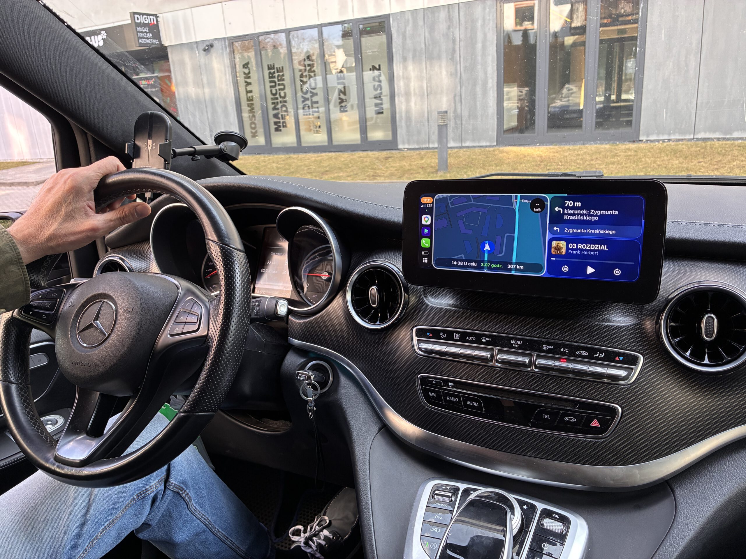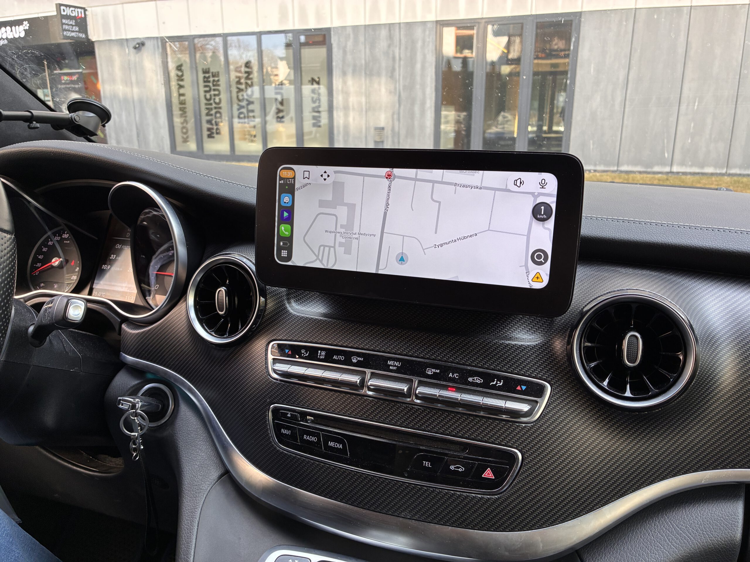 Poniżej Mercedes W447 V klasa z wymienionym ekranem i CarPlay