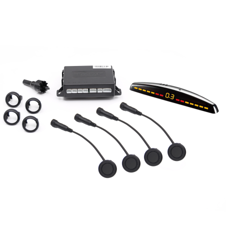 Zestaw czujników parkowania w klasycznym montażu (nieco wystające poza linię zderzaka). Zestaw z przejrzystym wyświetlaczem, przewidziany wyjściowo na tył jako czujniki cofania (do montażu na przodzie należy dokupić przedłużenie przewodów). Czujniki znajdą swoje miejsce także w autach z hakiem lub kołem zapasowym ponieważ mają opcję poszerzenia strefy z tyłu i nauki obrysu auta.