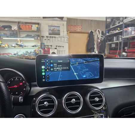 Poniżej Mercedes GLC (X253) z 2017 z wymienionym ekranem na dotykowy (wyświetla się menu CarPlay)